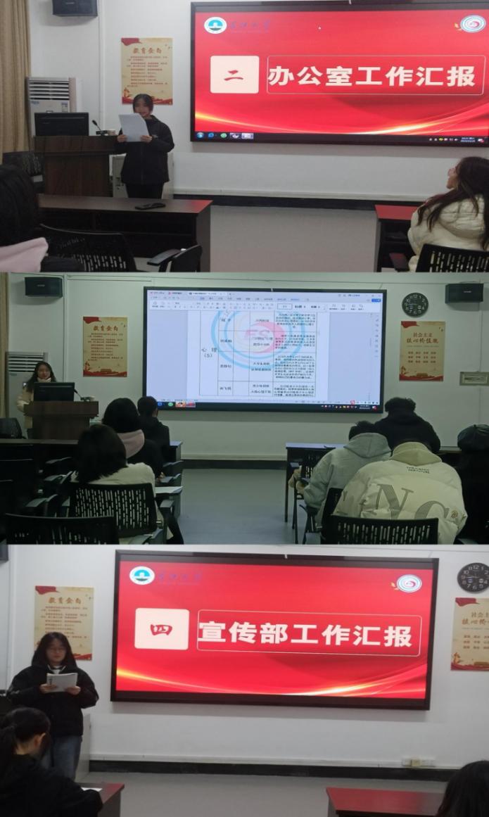 接着由各部门负责人围绕本部门职责和学期初确定的工作目标,简明扼要对队伍成立以来的工作进行了总结,认真查找了工作中的不足,对未完成工作进行了深入分析,提出了接下来的工作思路。陆宇对办公室前期的工作进行了汇报,她要求部门成员履职尽责,做好值班工作;落实奖惩制度,有功必奖有惩必究;提出设置“代理负责人”职位的建议。希望同大家共建一个轻松积极且有益的队伍氛围。田小平作组织培训部工作汇报,重点阐述力博志愿服务队未来工作重点项目——“5+N计划”。该计划由教育、心理、学前教育、体育、传统文化五个子项目、若干个子活动组成。子活动目前已提出25个,其中冬至文化传承活动已开展。汤静云作宣传部工作汇报,介绍新媒体运营小组的职能,并且指出接下来即将开展的工作——部门风采展。