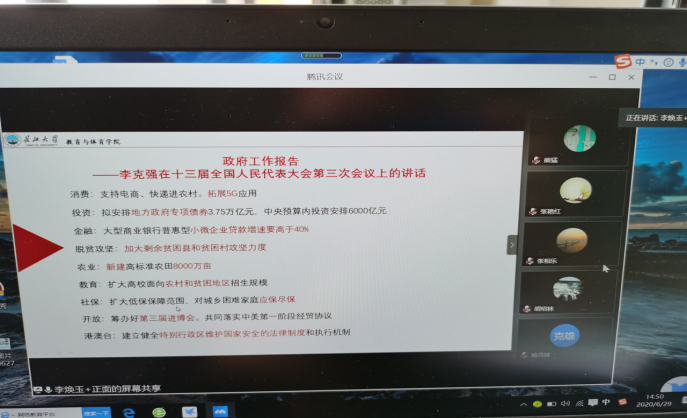 (通讯员 时晓)6月29日下午2:30,公司分党委通过“腾讯会议”在线召开了中心组理论学习,学习活动由分党委书记李焕玉主持。学习会上,李焕玉书记带领中心组成员认真学习了《习近平参加十三届全国人大三次会议湖北代表团审议时的重要讲话精神》、《2020年政府工作报告》、《湖北省委办公厅、省政府办公厅印发关于进一步做好新冠肺炎疫情常态化科学精准防控工作的实施意见》、 教育部等八部门印发《关于加快构建高校思想政治工作体系的意见》、教育部关于印发《高等公司课程思政建设指导纲要》的通知、新时代高校教师职业行为十项准则等文件。学习后,中心组成员针对《关于加快构建高校思想政治工作体系的意见》开展了集中交流讨论。大家一致认为:《关于加快构建高校思想政治工作体系的意见》深入贯彻习近平新时代中国特色社会主义思想,是对习近平总书记关于教育的重要论述,尤其是全国高校思想政治工作会议、全国教育大会、公司思想政治理论课教师座谈会精神的系统体现,对公司推动思想政治工作创新发展具有重大和深远意义。《意见》具有很强的指导性、针对性和可操作性,我们要以《意见》为遵循,在巩固好公司良好思想政治工作基础上,突出特色,深抓实效,实现思想政治工作体系与人才培养体系的有机统一。