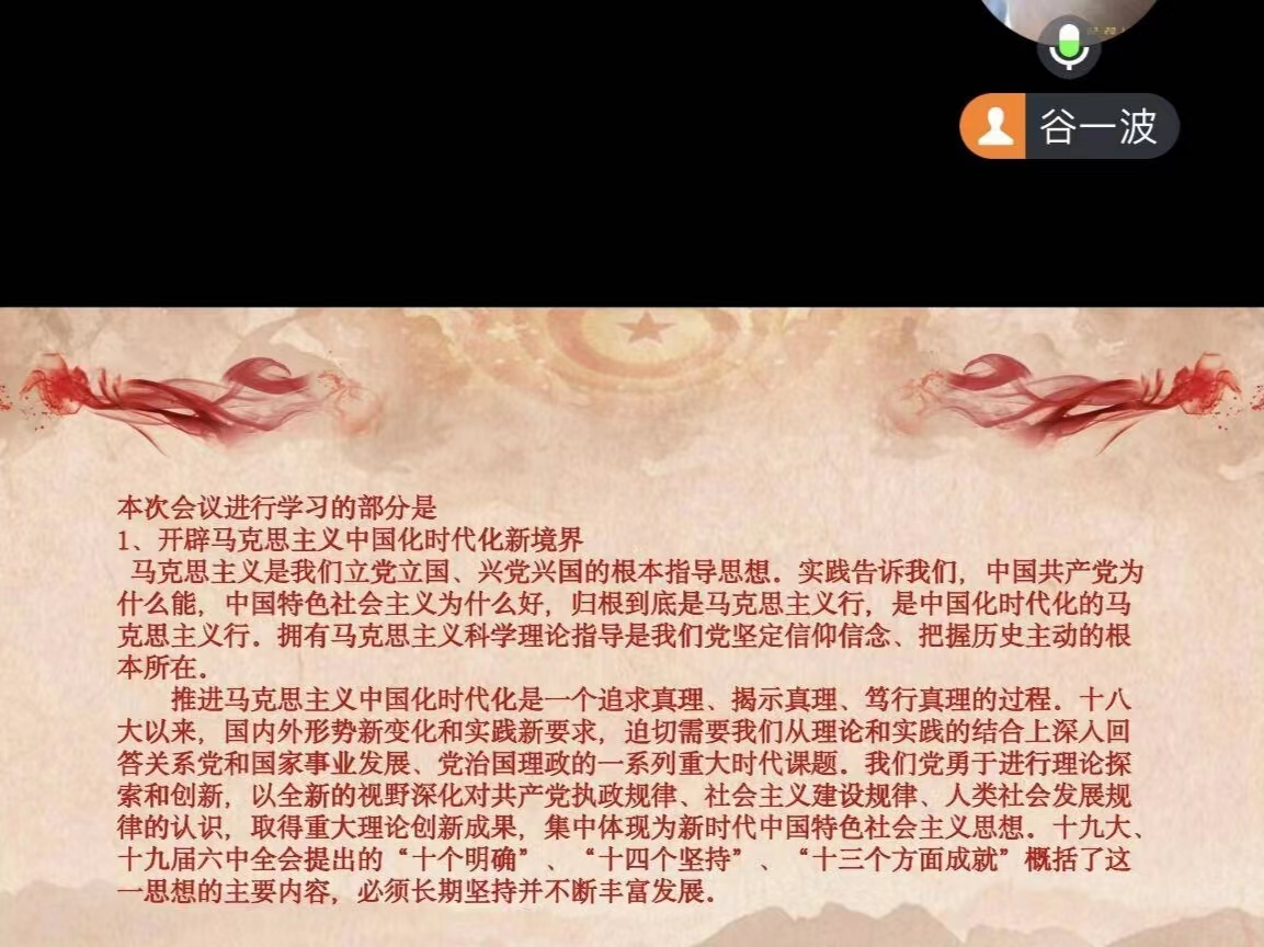 (通讯员 倪梓曦)2023年12月15日至30日,太阳集团tyc151cc全体研究生开展了十二月政治理论学习。本次政治理论学习各班分别采用线上线下结合的方式,由团支书进行组织学习,丰富了学习的形式。本次学习目的是为了加强全体研究生的政治理论素养,提高同学们的思想政治素质,推动深入学习贯彻习近平新时代中国特色社会主义思想,为实现中华民族伟大复兴的中国梦提供坚强政治保证。