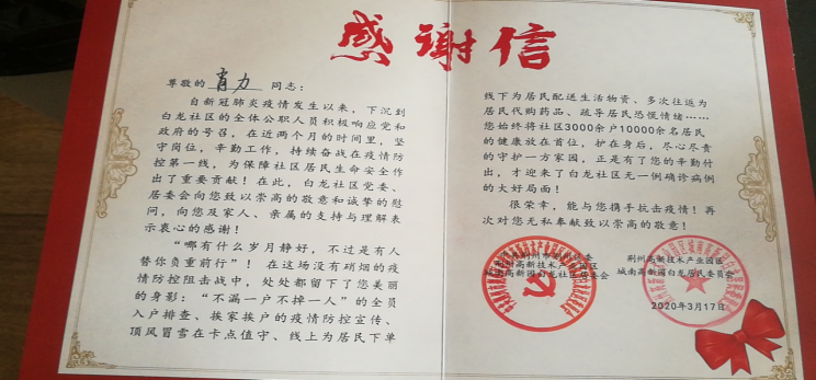 社区是疫情联防联控的第一线,也是内防扩散、外防输出最有效的防线。做为党员,肖力同志坚决贯彻落实中央和省市委决策部署,视疫情为命令,2月11日就下沉到荆州区白龙社区报道,2月12日到四机玫瑰苑小区值班。