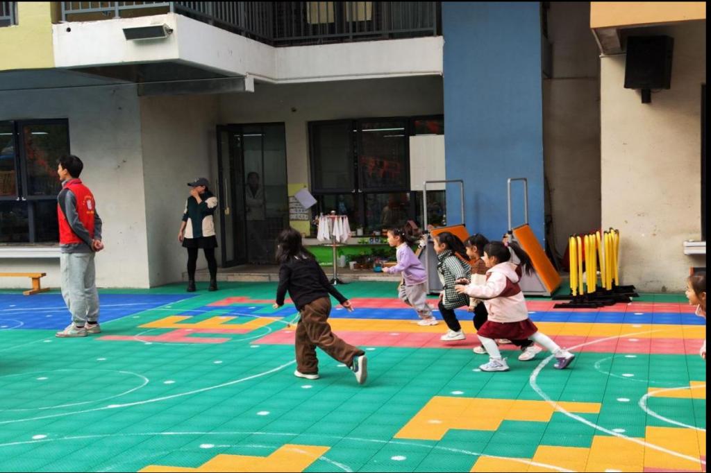 活动伊始,成员们带领小朋友们进行了充分的热身活动后,开始了第一场游戏“123木头人”。“比赛开始!”听到口令后,孩子们一边争先恐后的冲向前方,一边观察着前方的成员是否回头。“3..2..1..停!”孩子们立刻停下脚步,紧张的一动不动,游戏继续进行,几个回合后,最前面的小朋友出现一次失误,遗憾地回到了最后,而刚刚位列第二的小朋友也成功逆袭获得了第一,赢得了盲盒奖励。