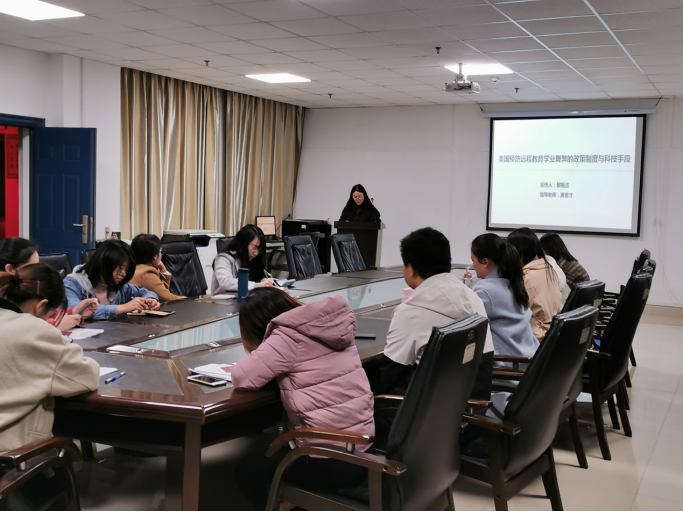首先是课程与教学论的黎榕洁同学,她就“美国远程教育预防学业舞弊的政策制度与科技手段”做了专题报告。黎榕洁同学主要是通过文献研究的方法,对美国政府政策、教育机构等发表的相关文献进行分析研究,提出了针对预防学业舞弊的一些思考。