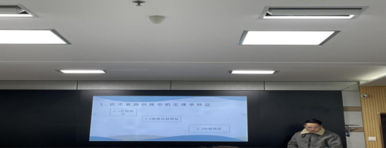 其次是体育教育训练学专业的李海涛同学,他就“基于运动生理视角下武术套路训练中的运动研究”做专题报告。他首先介绍了武术套路训练中的生理学特征,如功能特征、姿势反射特征、呼吸特征。运动生理学在武术套路训练中的运用、运动生理学在武术套路训练中的价值这三个部分进行详细汇报