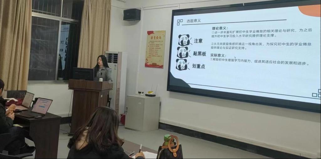 谭静同学汇报主题为《无效家庭情感环境对初中生学业倦怠的影响机制及其研究对策》,她从研究背景、研究思路和预期结果三个方面展开,其基于实际现象分析,探究了初中生学业倦怠的产生原因,并以此构建了一个序列中介机制。为验证该序列中介机制,预计进行两个研究来检验。研究一通过问卷法探讨无效家庭情感环境与初中生学业倦怠的关系,并考察无聊倾向与生命意义感的链式中介作用;研究二通过对初中生的生命意义感进行团体干预辅导降低其学业倦怠水平。