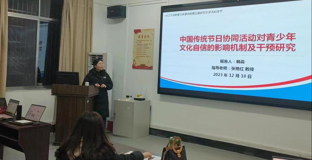 韩淼同学汇报主题为《中国传统节日协同活动对青少年文化自信的影响机制及干预研究》,她从问题提出、研究假设、研究方法、研究价值四个方面展开,以中国传统节日为切入点,来探讨其对青少年文化自信的影响,其中主要包括三个研究内容,采用访谈法来了解青少年对于中国传统文化节日的认知、情感、参与行为情况;采用问卷法,通过线下随机抽样,来探究中国传统节日协同活动对青少年文化自信的作用机制;采用团辅干预以了解中国传统节日协同活动对青少年文化自信的影响。