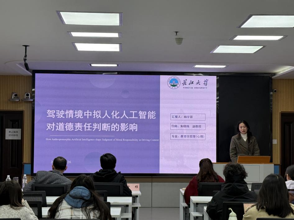 随后,杨宇蓉汇报的主题是《驾驶情境中拟人化人工智能对道德责任判断的影响》,她采用实验法和问卷法针对人工智能与道德责任判断的关系开展了全面而深刻的研究,数据分析简明合理,让我们对人工智能时代背景下,道德责任的判断有了更加深入的了解。