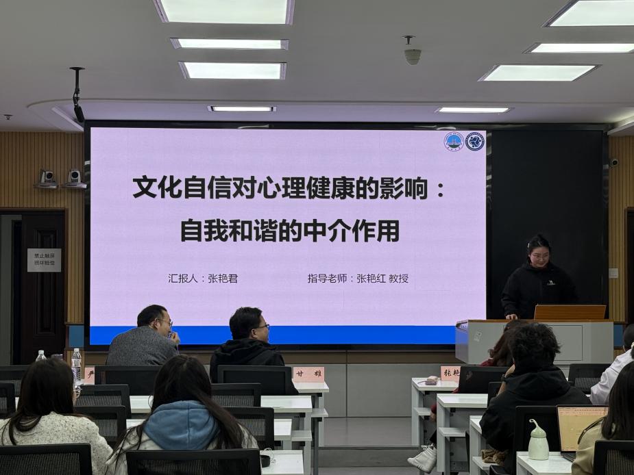 张艳君汇报的主题是《文化自信对心理健康的影响:自我和谐的中介作用》,她指出外显文化自信和内隐文化自信为两个独立系统,从自我和谐理论论证了自我内部的和谐以及自我与经验之间的协调,引人深思。