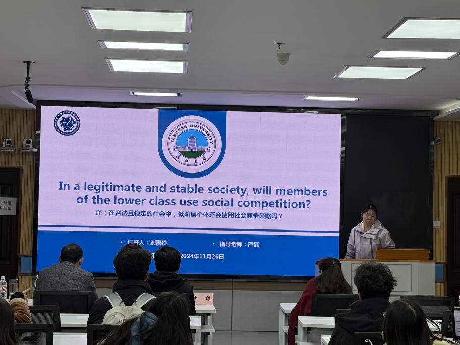 刘嘉玲汇报的主题是《In a legitimate and stable society, will members of the lower class use social competition?》,她指出社会认同理论中提出的影响弱势地位策略选用的因素之一,群体边界渗透性,是一种向上的地位渗透性。且在群体地位合理且稳定的社会中,地位渗透性是影响低阶层选择社会竞争策略的主要原因。