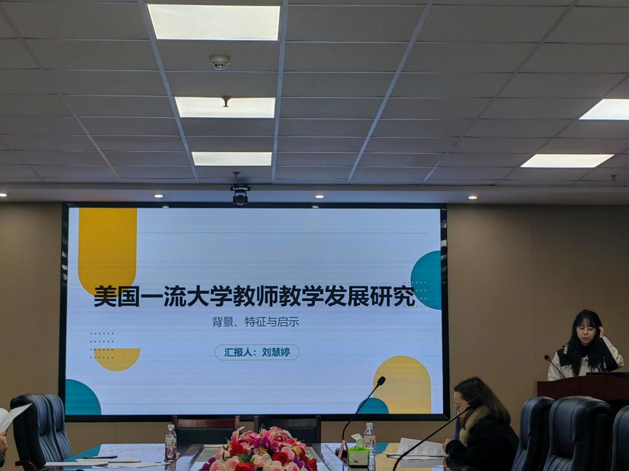 随后,刘慧婷就《美国一流大学教师教学发展研究》作汇报,指出美国一流大学通过建立专业性教学发展中心、激励性教学发展项目、目标性教学经费投入和有效性教学评价机制举措来促进教师教学发展。启示我国相关大学亦要从构建专业化教师发展机构,实施激励性的教学发展项目,投入专项性的教学发展经费和改革系列化的教学评价机制等一系列方式来促进教师教学发展。