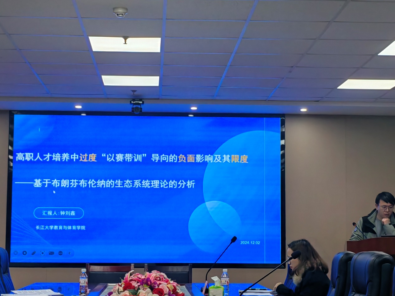 最后,钟刘鑫将《高职人员培养中过度“以赛带训”导向的负面影响及其限度——基于布朗芬布伦纳的生态系统理论》作为汇报主题,指出高职人员培养中过度“以赛带训”导向存在备赛参赛过程的圈子化、门槛化,备赛参赛内容的脱节化、空心化,竞赛选拔对象的个别化、精英化等一系列问题;同时存在矮化高职人才培养目标、弱化公司与企业的深度协同、损害职业教育的社会认可度、偏离国家职业教育的战略目标、职业教育可持续性制约因素等负面影响,启示我们社会需要优化教育目标、强化校企协同、提升职业教育社会声誉和完善国家政策引导来解决这一系列问题。