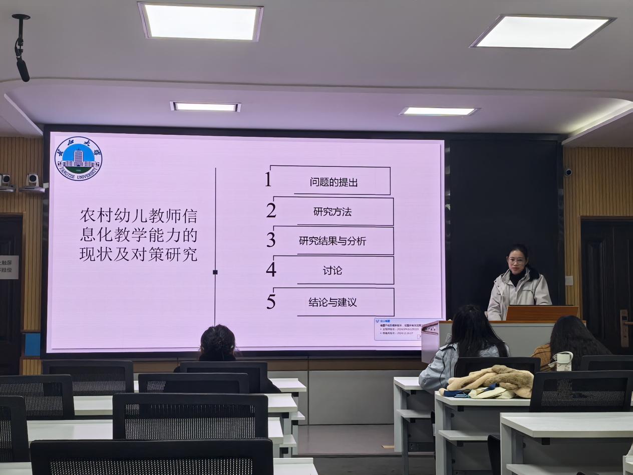 (通讯员 秦源)2024年12月16日晚,公司第六届研究生学术科技节第七场活动在文科大楼910报告厅举行。本次汇报人是学前教育学方向的研究生蒋淼、胡英杰、侯晓曼、赵玉娇,2023级、2024级学前教育专业研究生前来学习观摩。院研究生会宿建部部长周璇主持了本次活动。