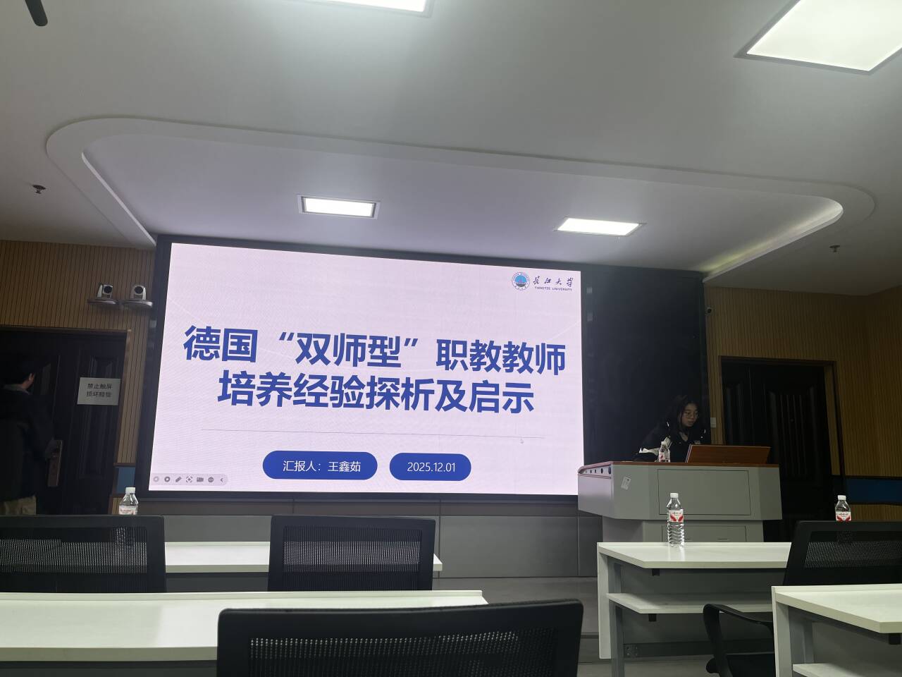王鑫茹汇报的主题是《德国“双师型”职教教师培养经验探析及启示》,她首先阐明德国“双师型”职教教师培养的经验,集中表现在重视职教的教师教育理念、严格的教师准入制度、系统的教师培训体系、健全的团队考评体系、完备的外部保障体系等方面。接着她主张我国可从更新职教教师培养观念、严控“双师型”教师选聘关口、健全教师培训体系、完善教师考评机制、强化外部制度保障等方面进行借鉴改进,从而加快构建我国高质量“双师型”职教教师队伍。