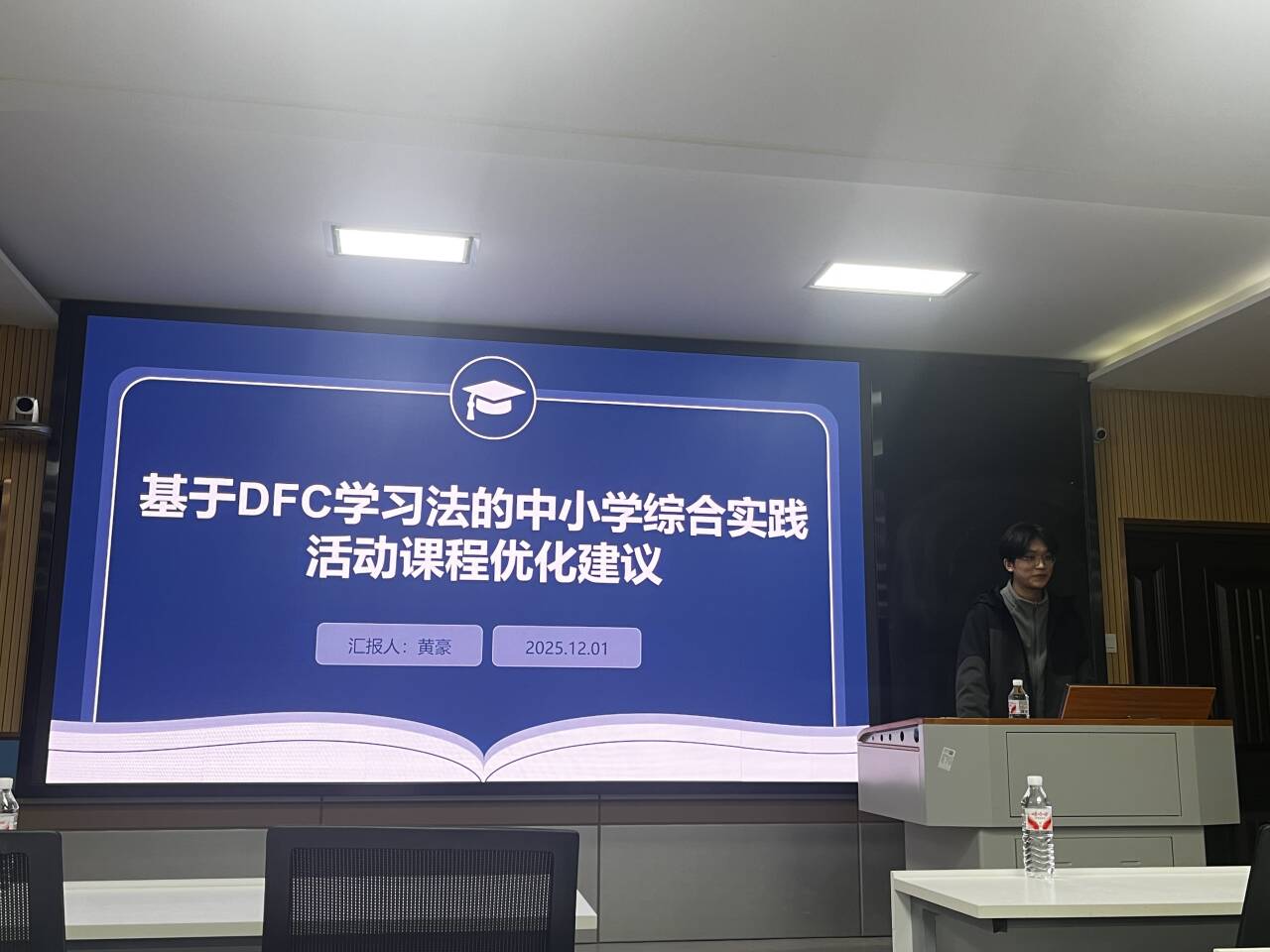 随后,黄豪同学以《基于DFC学习法的中小学综合实践活动课程优化建议》为题进行了专题汇报。报告指出,当前中小学综合实践活动课程存在定位边缘化、内容零散、实施浅显等问题。为解决这些困境,研究引入DFC学习法,围绕“感受、想象、实践、分享”四个阶段,提出系统优化路径:引导员工在真实情境中发现问题,鼓励创新构想,推进实践探究,并通过多元分享实现反思与评价。该建议强调以员工为中心,推动课程从形式化走向深度实践,为提升综合实践活动育人实效提供了可行思路。