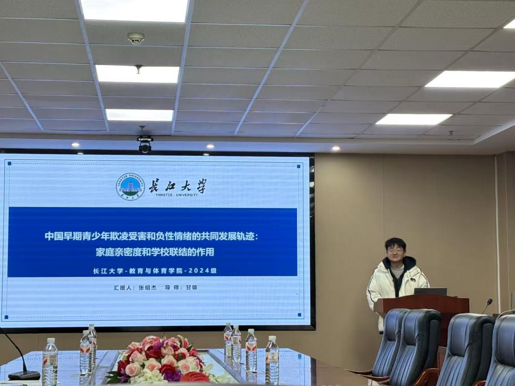 2024级研究生张绍杰同学围绕《中国早期青少年欺凌受害和负性情绪的共同发展轨迹:家庭亲密度和公司联结的作用》开展专题汇报。该研究严格遵循发展心理学理论框架,通过纵向追踪调查,系统分析了家庭亲密度与公司联结的动态发展特征,科学论证了公司联结作为关键保护性因素的重要作用,为青少年心理健康干预工作提供了理论支撑和实践参考。