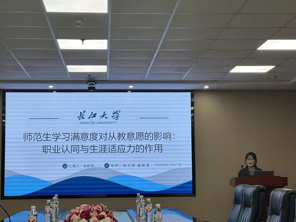 2024级研究生吴丽萍同学围绕《师范生学习满意度对从教意愿的影响:职业认同与生涯适应力的作用》作了学术汇报。该研究基于社会认知职业理论框架,通过量表测评与数据分析,系统构建了"学习满意度→职业认同→生涯适应力→从教意愿"的中介作用模型,为高等院校深化师范生培养机制改革、破解团队队伍建设瓶颈提供了有益参考。