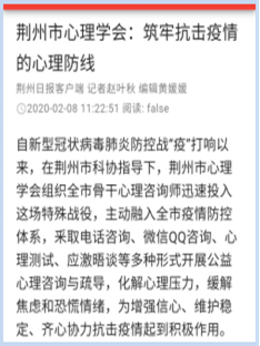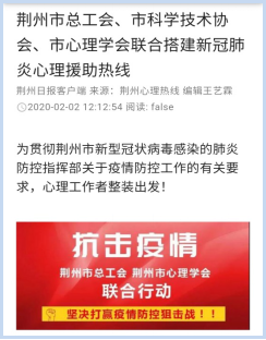 目前,荆州市心理学会的抗疫心理援助工作已经纳入“荆州市新型冠状病毒感染的肺炎防控指挥部”统一管理,得到了指挥部的大力支持和充分肯定,并受到湖北省科协、荆州市科协、荆州市总工会、荆州日报、荆州广播电视台等媒体和主管单位的广泛报道。