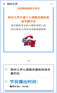录制1档抗疫心理援助节目。为扩大心理援助受众范围,荆州市心理学会与荆州广播电视台合作,于2月6日起开通“荆州之声”防控疫情心理热线特别节目,在972荆州之声和901汽车广播频道每天推出学会专家与听众的心理咨询互动广播,通过讲故事、分析案例的模式,面向大众普及心理科学的基础知识,传授疫情之下进行自我心理调节的实用方法。目前已经录制和播出的节目超过10期(如《如何远离疫情引起的不良情绪》(熊猛)、《疫情之下一线医务人员如何关爱自己》(文芳)等),深受广大听众欢迎。