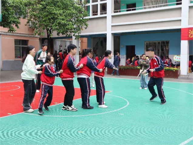 随后,志愿者们引领着同学和家长们步入礼堂,开启了丰富多彩的团体活动。在“搭桥过河”中,同学与家长们展现出了心有灵犀的默契;而“传递呼啦圈”则彰显了他们携手并肩的团队合作精神。家长们和志愿者们踊跃参与其中,比赛在欢声笑语中圆满结束。