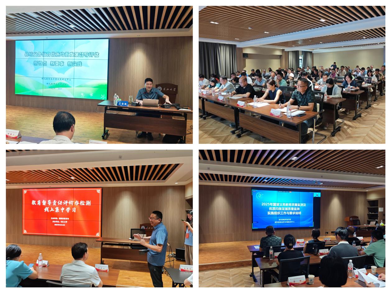 培训首日,专家讲座为学员筑牢理论基石。王金涛老师以《县域义务教育优质均衡发展评估新特点、新要求、新实践》为题,深入解析国家最新政策导向,聚焦资源配置精细化、教育质量内涵化、社会认可度科学化等评估标准的新变化。他结合荆州市实际情况,通过典型案例分析,提出“优化资源配置需注重城乡统筹”“教育质量提升需强化课程建设”等关键路径,引发学员深度思考。当晚,全体学员集中观看专题视频《教育督导责任评价与监测》,系统了解督导机制在推动优质均衡和普惠发展中的“指挥棒”作用,进一步强化责任意识与规范意识。